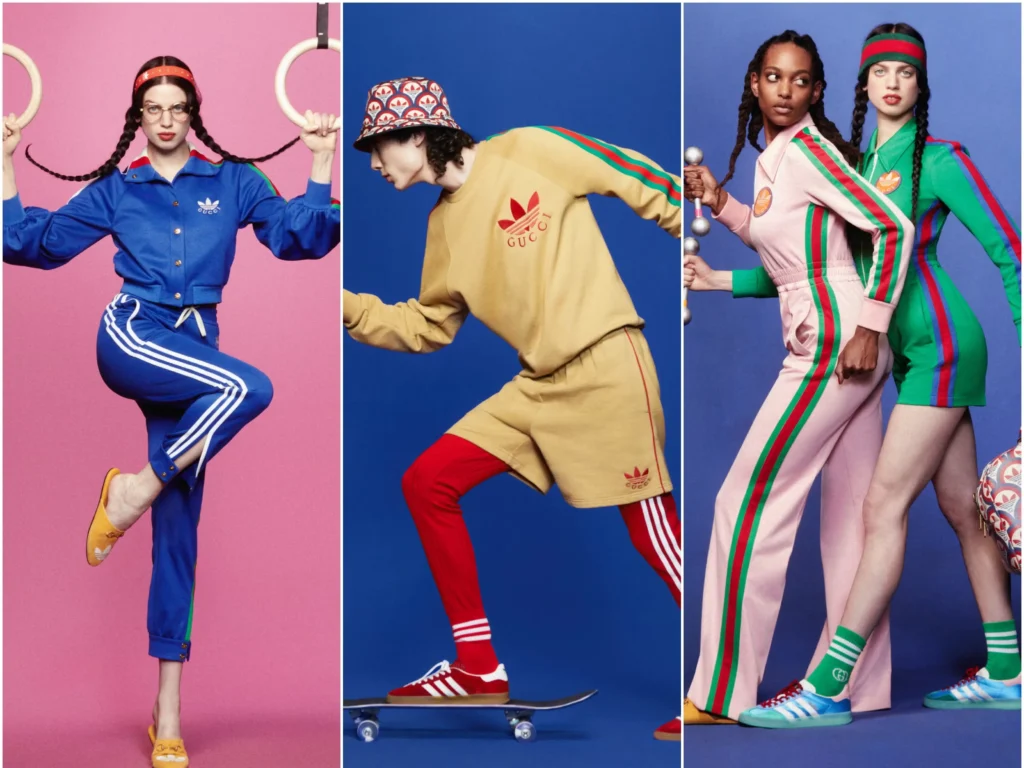 Gucci and Adidas Originals have teamed up for a fusion of heritage sportswear and high fashion. The collection reimagines classic Adidas tracksuits, sneakers, and accessories, blending Gucci’s luxury flair with Adidas’ athletic edge. The result? An eclectic, retro-inspired lineup featuring bold logos and vibrant prints.
