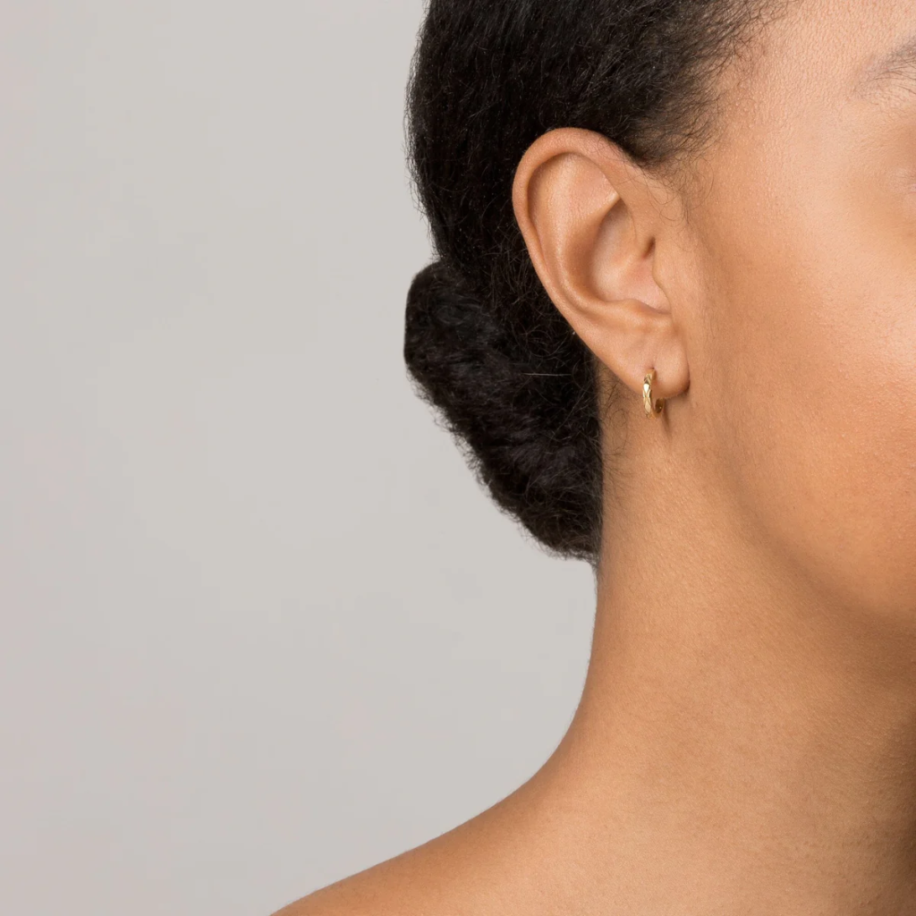 Crafted from 100% recycled gold, these quilted gold huggies feature a cross-hatch quilted design that offers just a touch of edge. The snug, sculptural hoops add instant personality to any ear stack, making them a standout everyday earring.